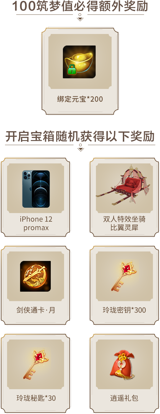 活动期间登录微信账号参加本活动,共筑逍遥江湖积累筑梦值后可参与抽奖。将活动页面分享好友可获取更多筑梦值,获得更多抽奖机会! 筑梦值满分为100,当进度达到20、40、60、80、100时,发起者各可以领取一次奖励,iPhone 12 Pro Max、特效双人坐骑、海量游戏元宝等你来拿! 筑梦值达到100分时,开启宝箱必得额外奖励:绑定元宝*200!(价值20元)